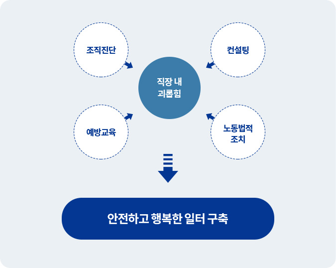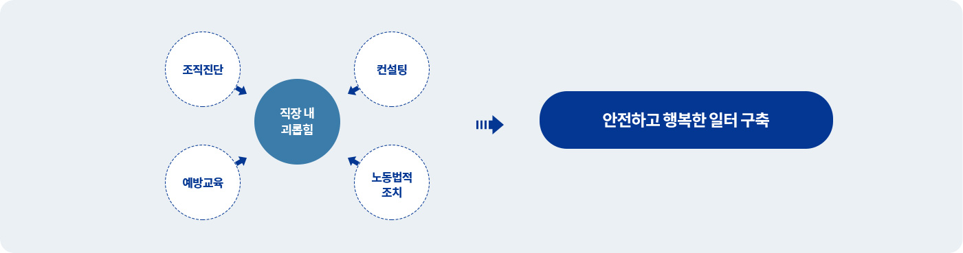 조직/HR 시스템 및 노동법 전문 역량을 모두 갖춘 컨설턴트가 기업 특유의 다양한 요소를 고려하여, 직장 내 괴롭힘 예방을 위한 실질적인 솔루션을 제공합니다.